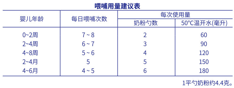 平勺奶粉 依照喂哺用量建議表,加入正确份量(平勺)的奶粉,請勿刻意壓平量勺。